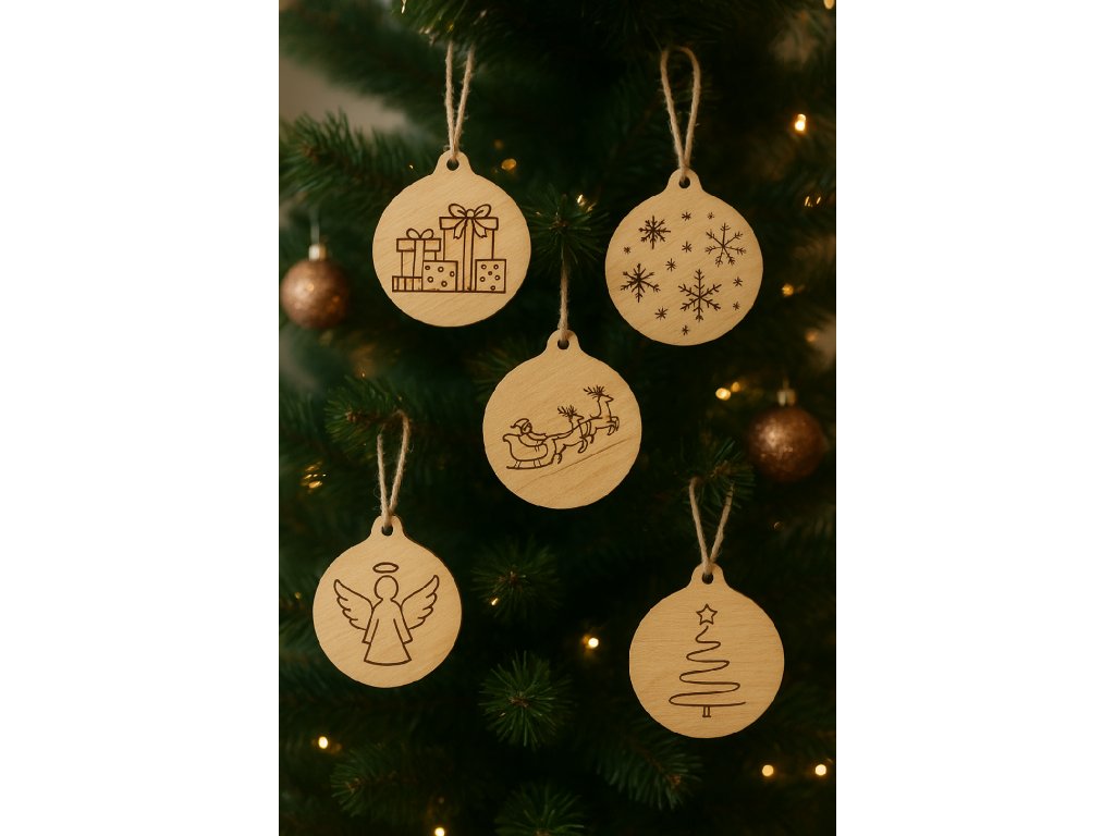 Vánoční ozdoby na stromeček, vyrobené z tenkého kousku meruňkového dřeva, které vyniká různorodou kresbou a strukturou. Průměr ozdoby 55 mm, gravírovaný motiv lze vytvořit na zakázku. Prodáváno jako sada 5 ozdob s pěti různými motivy, oboustranně gravírováno pomocí laseru.